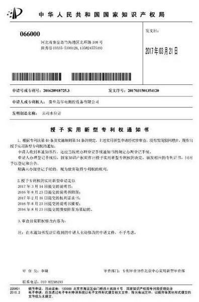 喜訊:秦皇島華電測控設備有限公司于2016年8月23日提交的“云母水位計”(專利號:2016209187253)專利已被中華人民共和國國家知識產(chǎn)權(quán)局授予專利權(quán)。此項專利的授權(quán),標志著公司已經(jīng)擁有36項自主知識產(chǎn)權(quán)。