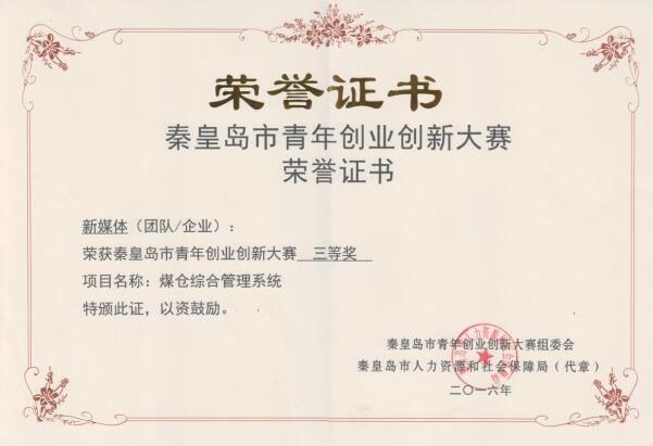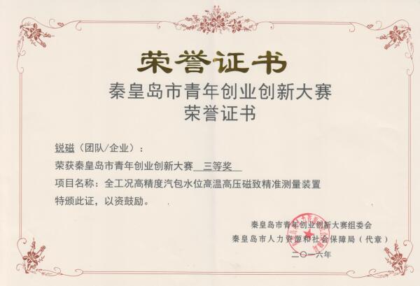 2016年5月,公司組建了“銳磁”和“新媒體”兩個團(tuán)隊,參加秦皇島市青年創(chuàng)業(yè)創(chuàng)新大賽,其中“銳磁”團(tuán)隊的參賽項目為《全工況高精度汽包水位高溫高壓磁致精準(zhǔn)測量裝置》,“新媒體”團(tuán)隊的參賽項目為《煤倉綜合管理系統(tǒng)》,經(jīng)過兩個團(tuán)隊的不斷開拓創(chuàng)新,兩個項目先后在市級、省級及國家級的比賽中連獲殊榮。《全工況高精度汽包水位高溫高壓磁致精準(zhǔn)測量裝置》獲得秦皇島市青年創(chuàng)業(yè)創(chuàng)新大賽三等獎,第二屆“中國創(chuàng)翼”青年創(chuàng)業(yè)創(chuàng)新大賽高端設(shè)備制造類項“金翼獎”;《煤倉綜合管理系統(tǒng)》獲得秦皇島市青年創(chuàng)業(yè)創(chuàng)新大賽三等獎,河北省青年創(chuàng)業(yè)創(chuàng)新大賽三等獎,第二屆“中國創(chuàng)翼”青年創(chuàng)業(yè)創(chuàng)新大賽高端設(shè)備制造類項“銀翼獎”。