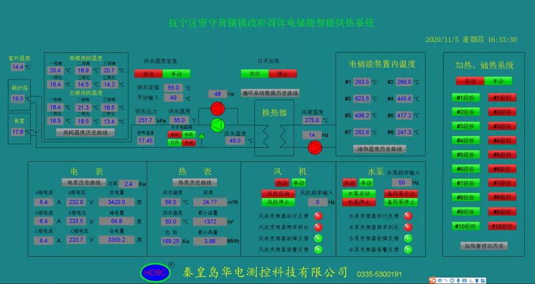2020年11月5日,秦皇島華電測(cè)控科技有限公司保質(zhì)保量地完成了秦皇島市某鎮(zhèn)政府供熱系統(tǒng)改造工作,并于11月5日開啟了供暖工作。本次改造工作,將原有的燃油鍋爐改造成智能電儲(chǔ)能供熱系統(tǒng),實(shí)現(xiàn)環(huán)保取暖與智能控制等多重效果。