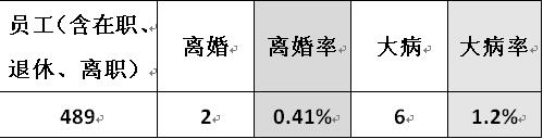 據(jù)統(tǒng)計,華電測控全體員工(含退休、離職人員)共計489人,從進(jìn)入華電測控起(含不在職人員追蹤數(shù)據(jù)),直至現(xiàn)在離婚人數(shù)僅有兩人, 大病人數(shù)6人,其中還包括年逾六旬的退休人員等。