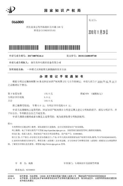 公司于2017年2月14日提交的“一種槽式太陽能聚光器鏡面的設(shè)計(jì)方法”(專利號(hào):201710078246.4)專利已被中華人民共和國國家知識(shí)產(chǎn)權(quán)局授予發(fā)明專利權(quán)。此項(xiàng)專利的授權(quán),標(biāo)志著公司已經(jīng)擁有43項(xiàng)自主知識(shí)產(chǎn)權(quán)。
