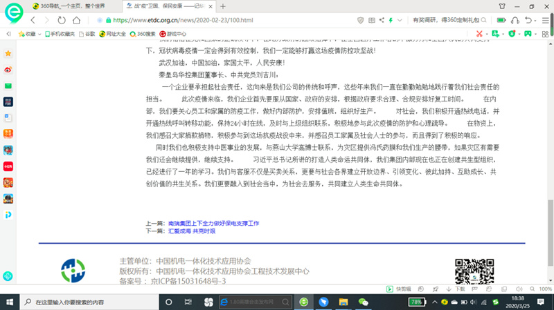 春節(jié)前夕,突如其來的疫情影響了整個(gè)中國,在這場(chǎng)戰(zhàn)“疫”面前,人人有責(zé),華控集團(tuán)作為一家負(fù)責(zé)任、有擔(dān)當(dāng)?shù)拿駹I企業(yè),積極貢獻(xiàn)了自己的力量!關(guān)于華控集團(tuán)《戰(zhàn)“疫”為國,保民安康》的通訊報(bào)道在中國機(jī)電一體化技術(shù)應(yīng)用協(xié)會(huì)工程技術(shù)發(fā)展中心網(wǎng)站刊登,對(duì)我公司在此次戰(zhàn)役做的貢獻(xiàn)進(jìn)行了肯定。大災(zāi)面前,應(yīng)有大愛,這場(chǎng)戰(zhàn)役面前,人人有責(zé)。但要怎么做、如何做,離不開一個(gè)積極向上公司正向的引導(dǎo),在這里我想華控集團(tuán)給我們做了一個(gè)很好的榜樣,讓我們知道了什么是責(zé)任、什么是擔(dān)當(dāng)、什么是大愛。