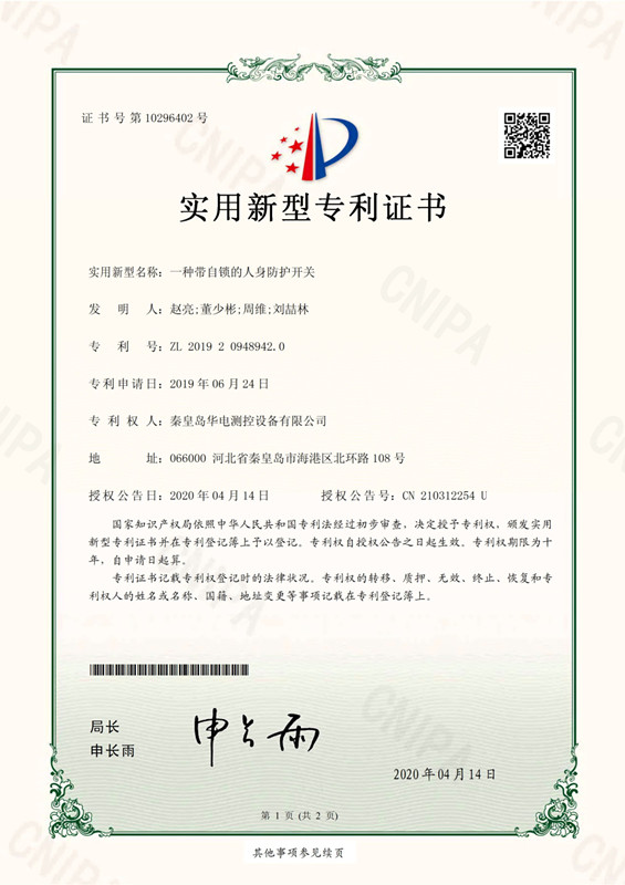 【企業(yè)要聞】公司申請的“一種帶自鎖的人身防護開關”獲頒專利證書