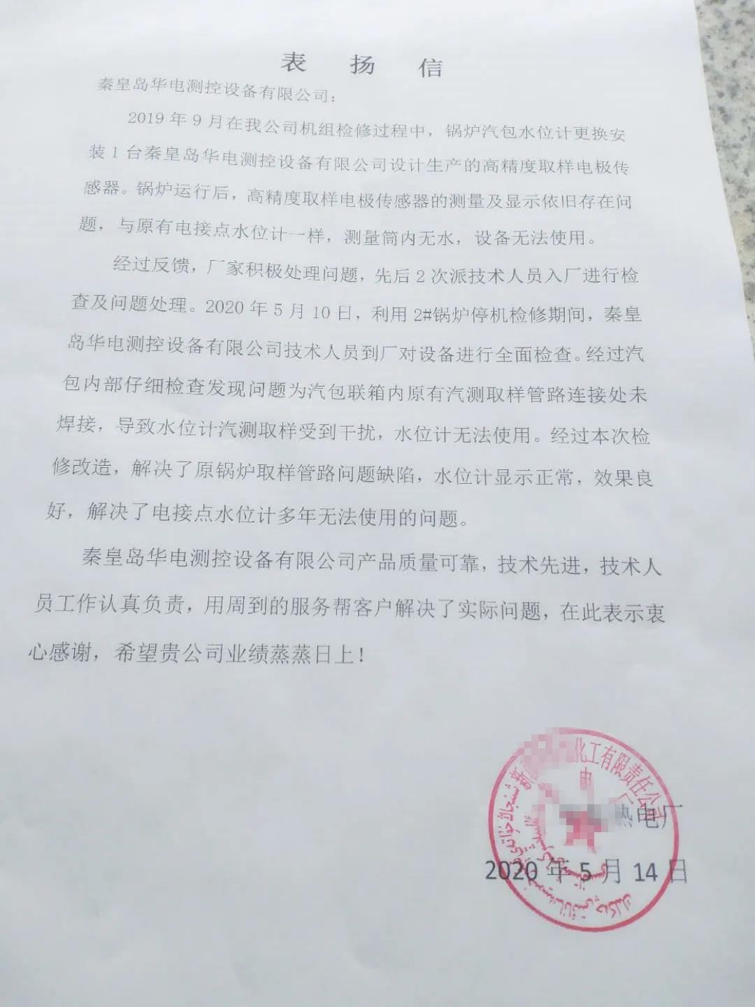 2020年5月15日,華電測控收到來自新疆某化工有限公司的表揚(yáng)信,表揚(yáng)我公司解決了該廠鍋爐汽包電接點(diǎn)水位計多年無法使用的問題。信中對我公司的產(chǎn)品質(zhì)量、全新全意為客戶服務(wù)的理念以及技術(shù)人員認(rèn)真負(fù)責(zé)的工作態(tài)度均給予肯定。