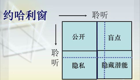 第二點(diǎn),劉總談到約哈利窗,教練就是將公開區(qū)域擴(kuò)大,最大限度的提高潛能。