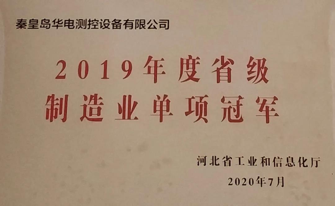 近日,秦皇島華電測控設(shè)備有限公司獲得了由河北省工業(yè)和信息化廳評選的“制造業(yè)單項冠軍”并頒發(fā)了榮譽證書。