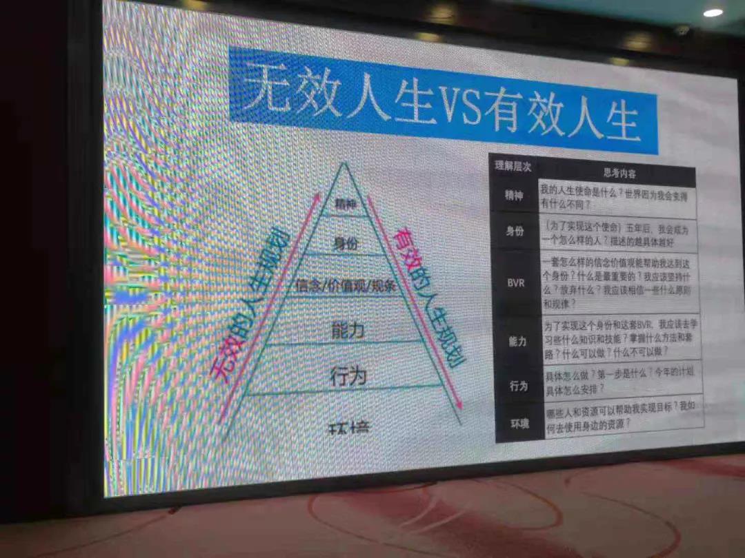 首先,劉老師將“有效人生”和”無效人生”進(jìn)行了對(duì)比。隨后,劉老師就“精神、身份、信念、能力、行為、環(huán)境”等幾個(gè)方面提出了問題,引導(dǎo)我們思考。
