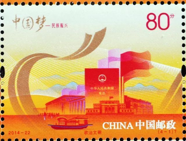 第四次:2014年9月20日,中國(guó)郵政發(fā)行2014-22《中國(guó)夢(mèng)―民族振興》郵票一套4枚,其中(4-1)“政治文明”圖案由包括南湖紅船在內(nèi)的建黨治國(guó)元素組成:郵票畫(huà)面從政治角度體現(xiàn)出黨和國(guó)家成立以來(lái)社會(huì)制度取得的巨大進(jìn)步。在這枚郵票上,既有上海一大會(huì)址,突出的嘉興南湖紅船又賦予了新的時(shí)代意義。