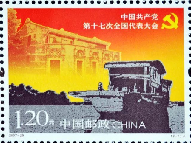第三次:2007年10月15日,中國(guó)共產(chǎn)黨第十七次全國(guó)代表大會(huì)在北京召開(kāi),中國(guó)郵政發(fā)行《中國(guó)共產(chǎn)黨第十七次全國(guó)代表大會(huì)》紀(jì)念郵票一套2枚,“南湖紅船”與上海中共“一大”會(huì)址,并立設(shè)計(jì)在《中共“一大”會(huì)議會(huì)址》郵票上,這是“南湖紅船”第三次上國(guó)家郵票圖,票幅44X33毫米,陳幼林、王戈設(shè)計(jì)。
