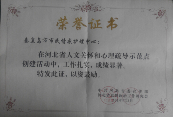 2014年11月,秦皇島市市民情感護理中心在河北省人文關(guān)懷和心理疏導(dǎo)示范點創(chuàng)建活動中,工作扎實,成績顯著,喜獲中共河北省委宣傳部、河北省思想政治工作研究會頒發(fā)的榮譽證書。