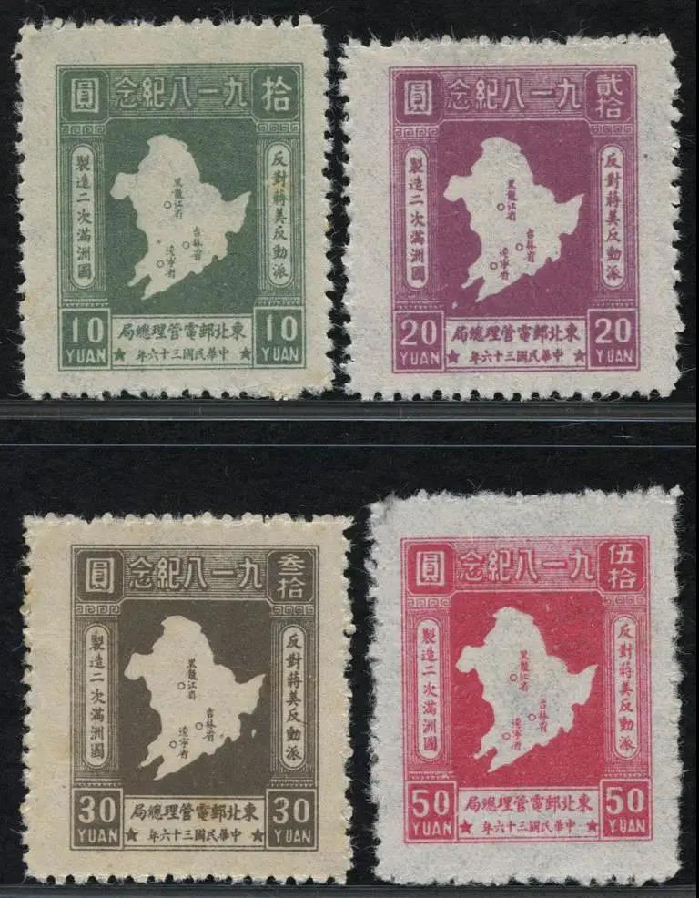 該套郵票一套4枚,圖案相同,就是刷色和面值各異。郵票的圖案主體為中國東北三省地圖,圖中明確標(biāo)明三省省會的位置和各省名稱。圖案上方印刷郵票主題―“ 九一八紀(jì)念”,下方印刷“ 東北郵電管理總局★中華民國三十六年★”發(fā)行單位和發(fā)行時間,左右兩側(cè)印刷當(dāng)時的口號“ 反對蔣美反動派,制造二次滿洲國”。這套郵票是由哈爾濱廣發(fā)印刷所承印,特別值得一提的是,該套郵票所用的紙張系為原偽滿洲國郵政局遺留庫存的水印絹絲紙,這也是“九一八事變”之后日本侵略者侵占了東北三省長達14年的證據(jù)之一(當(dāng)時庫存之大,甚至到建國后,新中國發(fā)行的東普二也使用這款“ 水印紙 ”)。