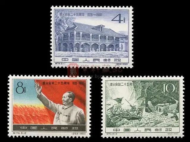 1960年1月25日,當(dāng)時的郵電部發(fā)行了紀(jì)74《遵義會議二十五周年》紀(jì)念郵票一套,全套三枚,圖案分別為“遵義會議會址”、“在毛澤東旗幟下永遠(yuǎn)勝利地前進”、“強渡金沙江”。3枚郵票上均標(biāo)有“遵義會議二十五周年1935―1960”字樣。