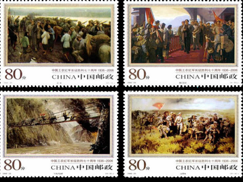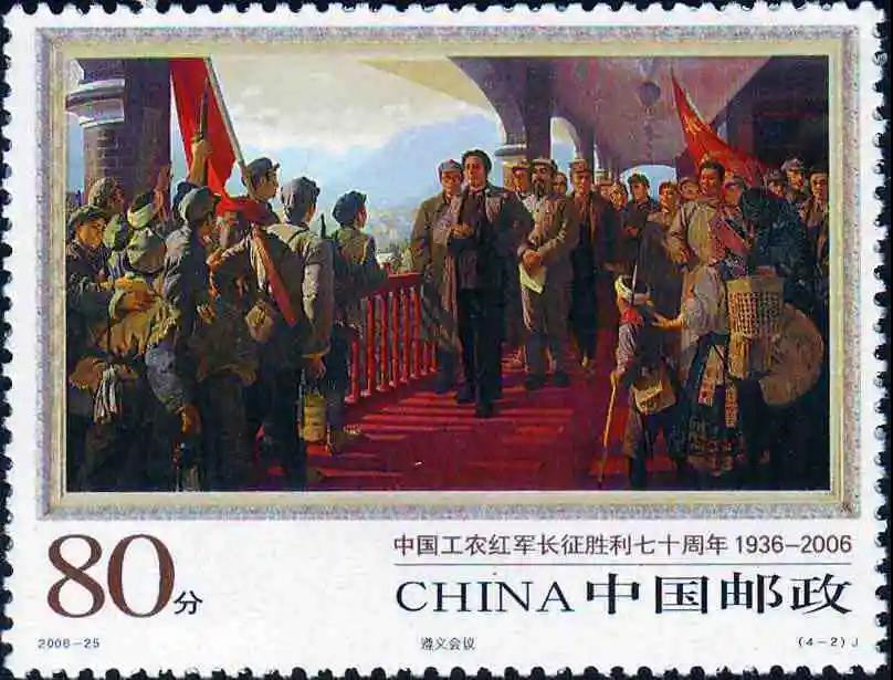 遵義會議作為紅軍長征途中的重要會議,也曾出現(xiàn)在2006年10月22日發(fā)行的《中國工農(nóng)紅軍長征勝利七十周年》的紀(jì)念郵票1套4枚中。志號:2006-25,設(shè)計者:郝旭東。畫作者:靳尚誼(4-1)、彭 彬(4-2)、劉國樞(4-3)、張文源(4-4)、李寶林周順愷(小型張)。