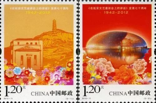 中國郵政于2012年5月23日發(fā)行《<在延安文藝座談會上的講話>發(fā)表七十周年》紀念郵票1套2枚。票圖名稱分別為“座談會舊址”、“文藝發(fā)展繁榮”,郵票面值均為1.20元。設(shè)計者為郭線廬。郵票發(fā)行同時推出郵票首日封。