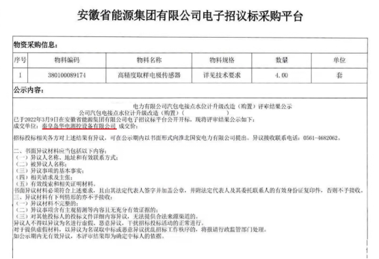 2022年3月18日,安徽某發(fā)電公司“電接點水位計改造項目”招標(biāo)結(jié)果公示,秦皇島華電測控設(shè)備有限公司被評選為中標(biāo)單位。中標(biāo)產(chǎn)品“高精度取樣電極傳感器”,數(shù)量4套,本月底前我公司將完成施工改造。