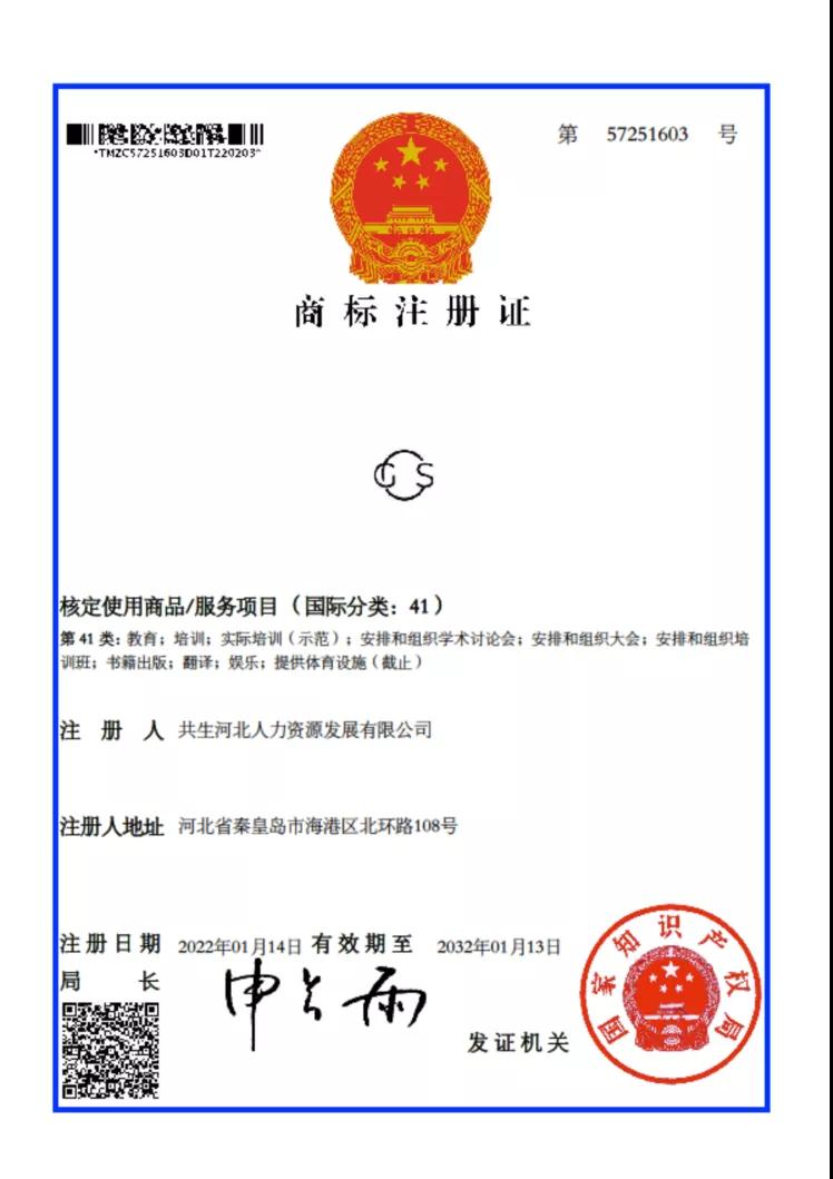 近日,共生河北人力資源發(fā)展有限公司提交的logo被中華人民共和國國家知識產權局頒發(fā)商標注冊證,注冊日:2022年1月14日,授權公告號:第57251603號。