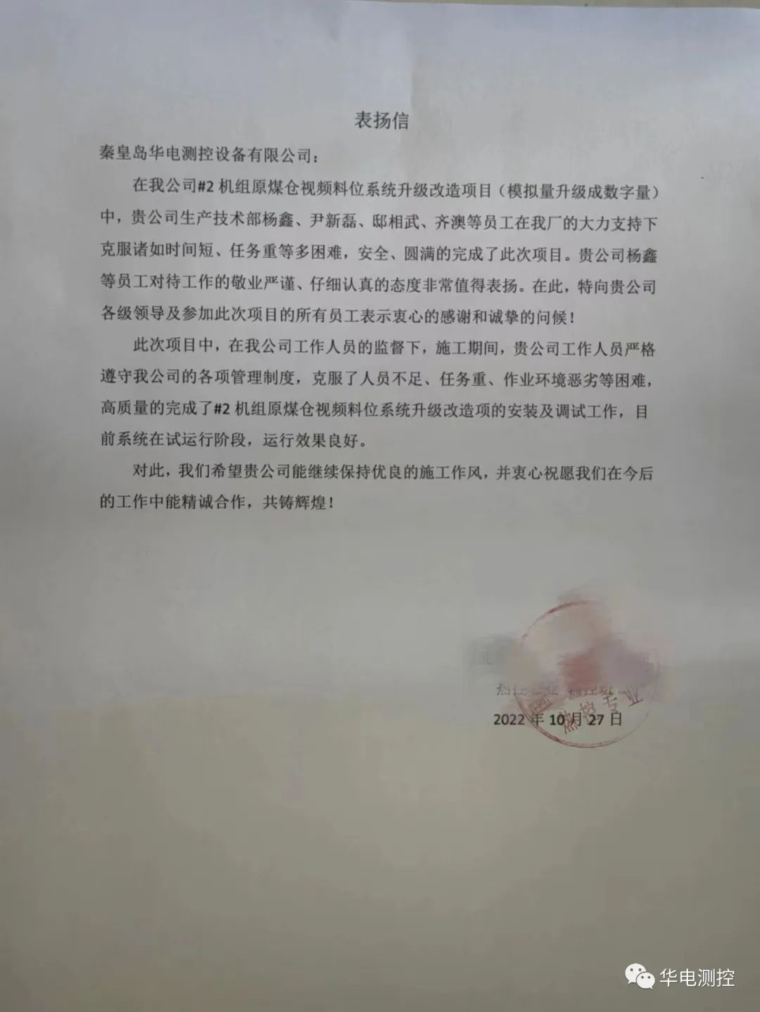 客戶對我們產(chǎn)品和服務(wù)的認(rèn)可,便是我們最大的收獲和動力。秦皇島華電測控設(shè)備有限公司一直以來秉承著“以坦誠交朋友,以創(chuàng)新謀發(fā)展,以質(zhì)量求生存,以服務(wù)贏信譽,以改進(jìn)拓市場”的企業(yè)經(jīng)營方針,急用戶之所急、產(chǎn)用戶之所需,為電廠安全運行保駕護(hù)航。