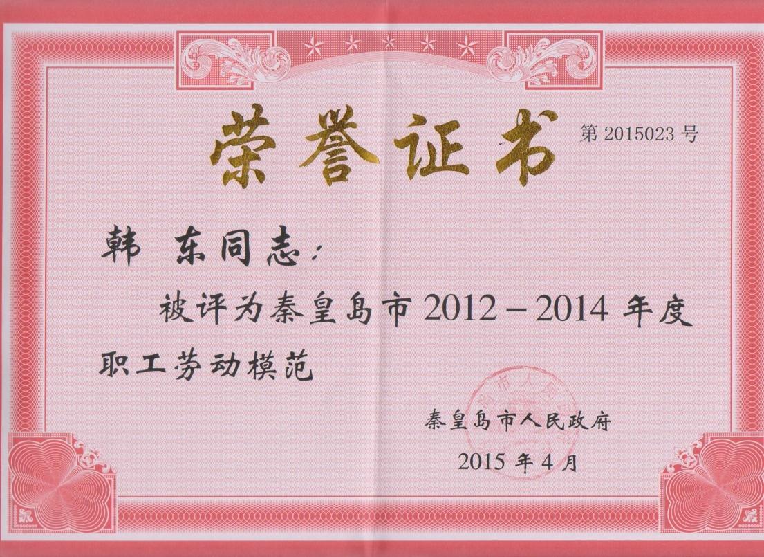 【企業(yè)要聞】熱烈慶祝我公司韓東被評(píng)為秦皇島市勞動(dòng)模范