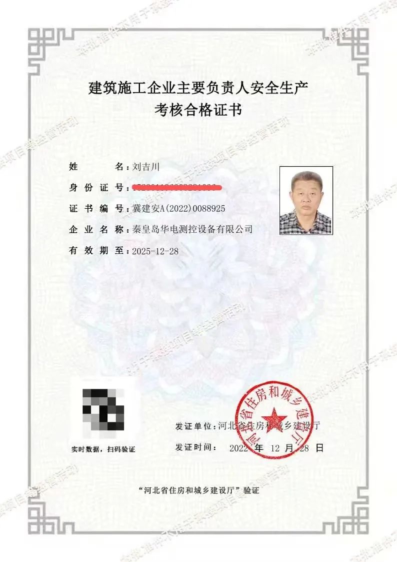 祝賀秦皇島華電測(cè)控設(shè)備有限公司獲批建筑施工安全生產(chǎn)許可證書(shū)