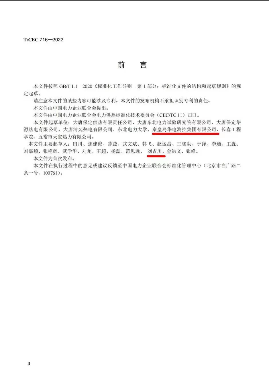 秦皇島華電測(cè)控集團(tuán)有限公司參與編制的團(tuán)體標(biāo)準(zhǔn)——《火力發(fā)電廠智能熱網(wǎng)供熱服務(wù)規(guī)范》(T/CEC 716—2022)于2022年10月26日由中國(guó)電力企業(yè)聯(lián)合會(huì)發(fā)布,2023年2月1日實(shí)施。該標(biāo)準(zhǔn)文件由中國(guó)電力出版社出版、印刷、發(fā)行,規(guī)定了火力發(fā)電廠智能熱網(wǎng)供熱服務(wù)的質(zhì)量與要求、運(yùn)行與維護(hù)、服務(wù)與管理、服務(wù)質(zhì)量評(píng)價(jià)等。