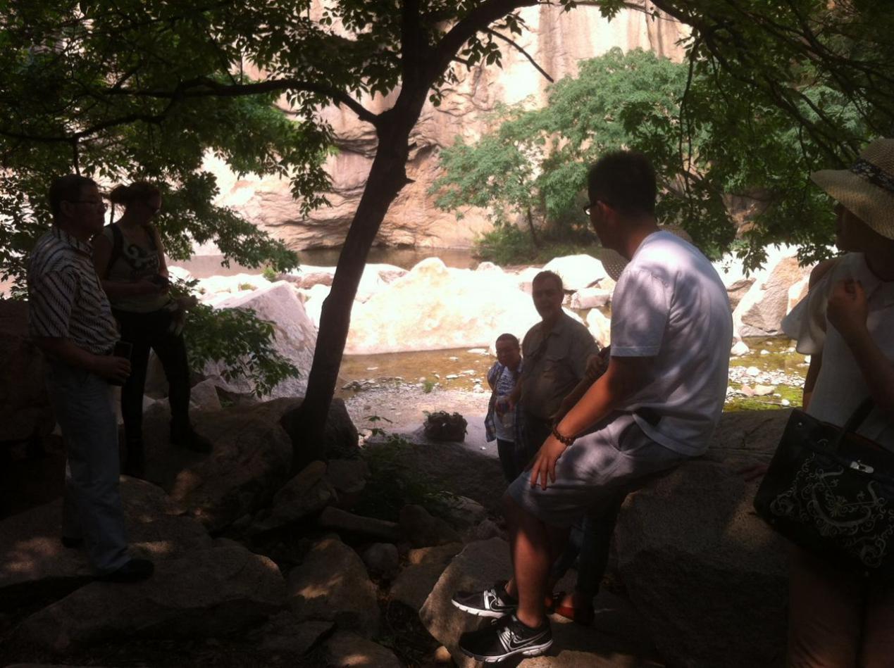 在公司總經(jīng)理劉吉川先生的引領下,邁克、安娜等一行八人攀登了長壽山景區(qū)的九重天山峰,穿越一線天,駐足山巔,登高望遠,邁克和安娜無不為眼前這雄偉壯觀的風景所驚嘆。隨后,又依次參觀了懸陽洞、神醫(yī)石窟、壽字碑林等景區(qū),領略其中的歷史文化和人文精神。在山底的一堆巖石中,劉總帶領邁克和安娜見證了“生命的力量”,這是一棵從亂石崗中生長出來的大樹,它為了生存,需要更大的力量去向下生根以獲取水源,向上攀爬以獲取陽光,用自己的生命高度地詮釋了“夾縫中求生存”,這種生命的力量激勵著劉總用更大的勇氣和信心去建設華電測控。美國友人邁克感同身受,感慨道:“No pain, no gain.”(譯文:沒有痛苦,就沒有收獲)。安娜則對中醫(yī)文化情有獨鐘,劉吉川先生向她講解了刮骨療傷的故事,并借著李時珍、華佗等神醫(yī)石窟的雕像,概述了中國中醫(yī)文化的歷程。安娜不時地給雕像和碑文拍照,并把劉總的講解記錄在了她的日記本中,安娜說她回國后馬上就要開始讀醫(yī)學的研究生,劉總生動的講解激發(fā)了她對醫(yī)學,特別是中醫(yī)學的興趣,真是起到了拋磚引玉的作用。