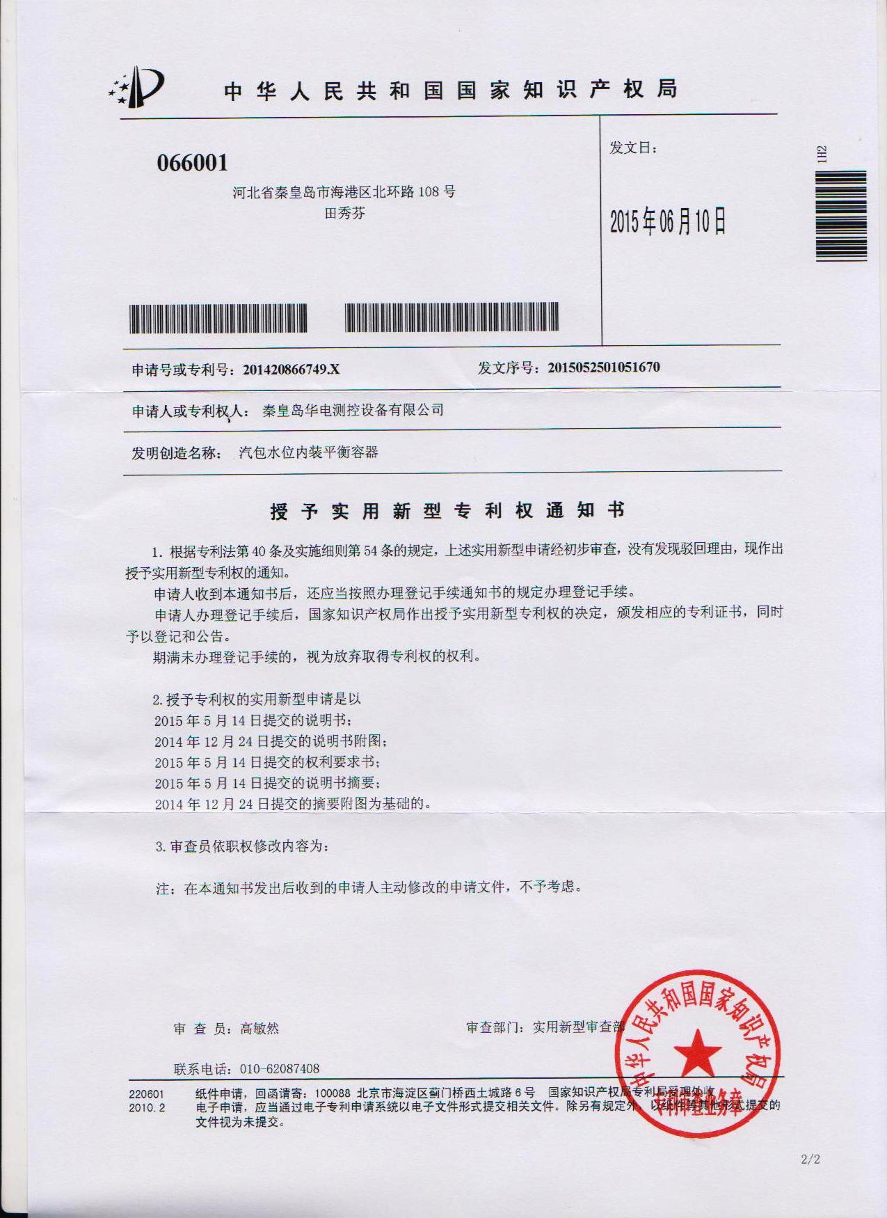 公司于2014年12月24日提交的“汽包水位內裝平衡容器”專利已被中華人民共和國國家知識產權局授權實用新型專利權。