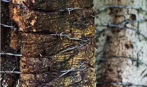 有一年,當?shù)匕l(fā)生了一種奇怪的植物真菌疫病,方圓幾十公里的榆樹全部死亡,唯獨那顆箍了鐵圈的榆樹卻存活下來。