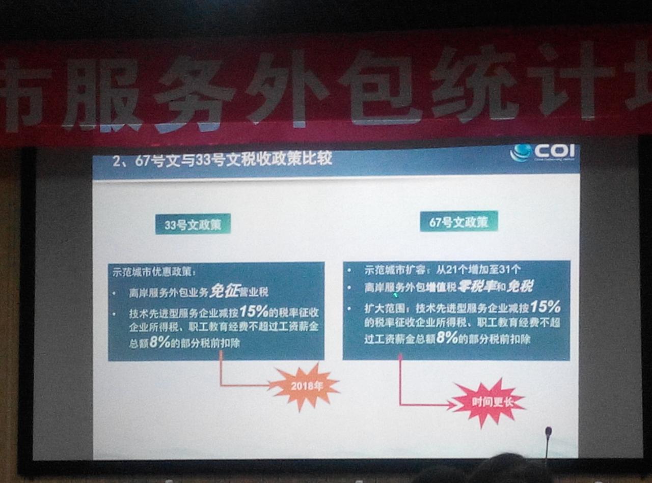 通過本次培訓(xùn)清晰了什么是服務(wù)外包;服務(wù)外包的分類:2014年現(xiàn)行統(tǒng)計標準分為三個門類(ITO信息技術(shù)外包、BPO業(yè)務(wù)流程外包、KPO知識流程外包),九個大類(軟件研發(fā)外包、信息技術(shù)服務(wù)外包、運營和維護服務(wù)、內(nèi)部管理外包服務(wù)、業(yè)務(wù)運營外包服務(wù)、供應(yīng)鏈外包服務(wù)、商務(wù)服務(wù)外包、技術(shù)服務(wù)外包、研發(fā)服務(wù)外包),35個中類;服務(wù)外包與服務(wù)貿(mào)易之間的關(guān)系等。服務(wù)外包產(chǎn)業(yè)的發(fā)展在國家政策《國務(wù)院關(guān)于促進服務(wù)外包產(chǎn)業(yè)加快發(fā)展的意見》國發(fā)[2014]67號文件(離岸服務(wù)外包增值稅零稅率和免稅,擴大范圍:技術(shù)先進型服務(wù)企業(yè)減按15%的稅率征收企業(yè)所得稅,職工教育經(jīng)費不超過工資薪金總額8%的部分稅前扣除)的支持力度下,不斷成長提升。通過建立的有效溝通和營銷渠道,構(gòu)建交易平臺,積極走出去,尋求與國際接軌的走向國際的策略,借助云計算、大數(shù)據(jù)等新技術(shù)融合共同發(fā)展。最后,主辦方秦皇島市商務(wù)局代表做了總結(jié)發(fā)言,還為大家精心準備了冷餐,就餐的同時大家相互交流,彼此相互了解。