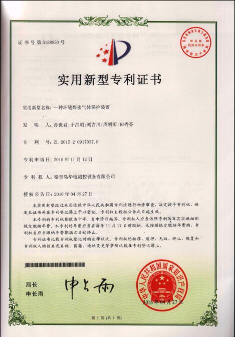 在此項目研發(fā)過程中,由于昌明和孫世君共同研發(fā)的“一種環(huán)縫焊接氣體保護裝置”已被中華人民共和國國家知識產(chǎn)權(quán)局頒發(fā)實用新型專利證書。