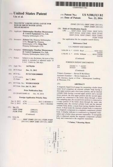 好消息:公司于2014年7月向美國提交的“汽包水位磁致液位計”發(fā)明專利申請,經(jīng)過Director of the United States Patent and Trademark Office嚴(yán)謹(jǐn)認(rèn)真的審查,已經(jīng)于2016年11月22授予了發(fā)明專利權(quán),頒發(fā)了美國發(fā)明專利證書,專利號為:U.S.Patent No.9500513 B2。