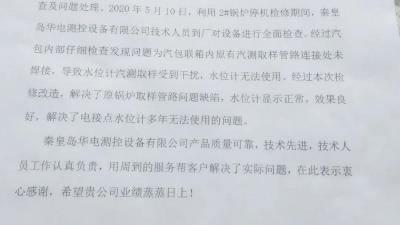 2020年5月15日,華電測控收到來自新疆某化工有限公司的表揚信,表揚我公司解決了該廠鍋爐汽包電接點水位計多年無法使用的問題。信中對我公司的產(chǎn)品質(zhì)量、全新全意為客戶服務(wù)的理念以及技術(shù)人員認真負責的工More