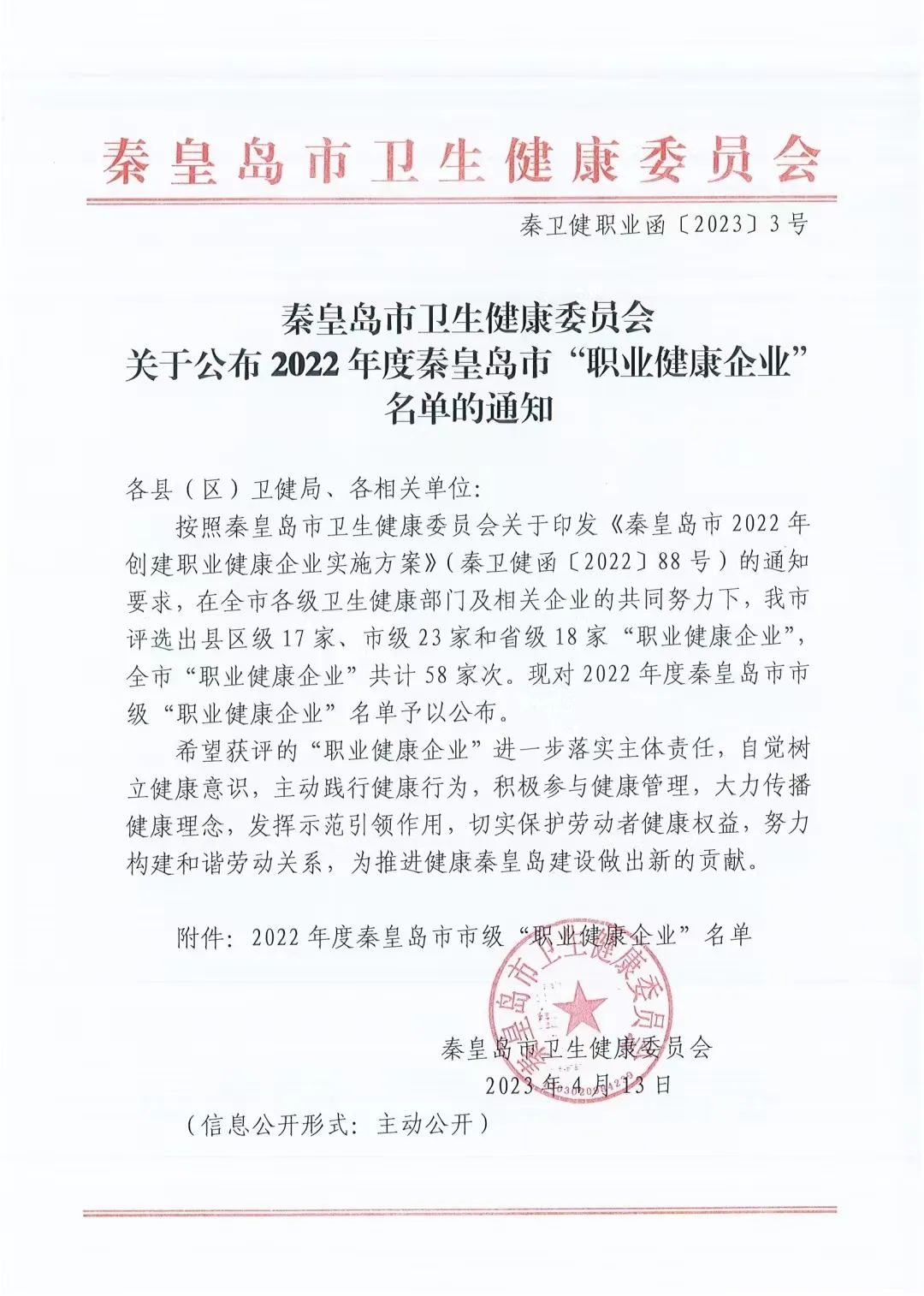 2023年4月21日,我公司獲悉來(lái)自秦皇島市衛(wèi)生健康委和秦皇島市海港區(qū)衛(wèi)生健康局的文件通知,秦皇島華電測(cè)控設(shè)備有限公司獲評(píng)為2022年度市級(jí)“職業(yè)健康企業(yè)”。為更好More