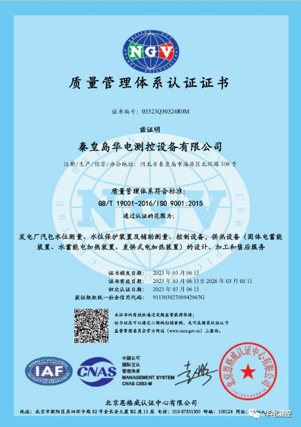 華電測控順利通過ISO9001質(zhì)量管理體系再認證” 2023-03-072023年3月7日,秦皇島華電測控設備有限公司收到來自北京恩格威認證中心頒發(fā)的《質(zhì)量管理體系認證證書》,這表明華電測控2023年ISO9001質(zhì)量管理體系再認證順利通過!秦皇島華電測More