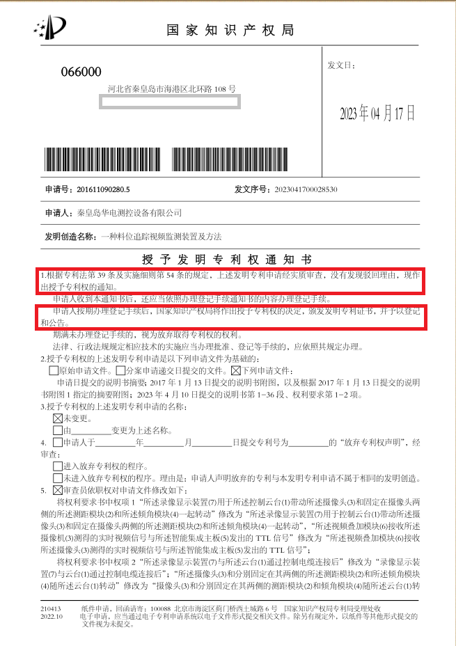 華電測控設備有限公司又獲一項發(fā)明專利” 2023-04-252023年4月17日,秦皇島華電測控設備有限公司收到國家知識產(chǎn)權局發(fā)來的《一種料位追蹤視頻檢測裝置及方法辦理登記手續(xù)通知書》和《一種料位追蹤視頻檢測裝置及方法授予發(fā)明專More